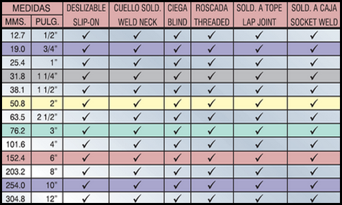 Observa las caracteristicas de bridas de acero inoxidable,con el cual se cuenta con tipos de AISI 304 y 316, #150,#300 y #600.