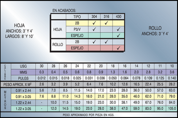 Puedes ver la tabla de Laminas de acero inoxidable, con el cual se cuenta con el tipo AISI 304,316, 430.